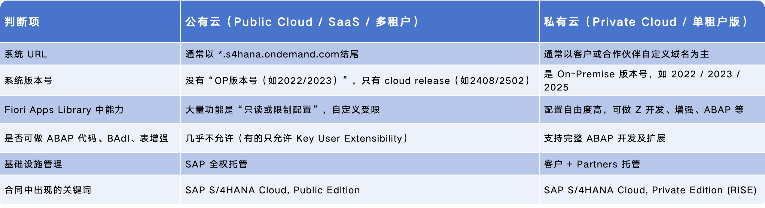 如何确认在使用的SAP系统是公有云版本还是私有云版本?